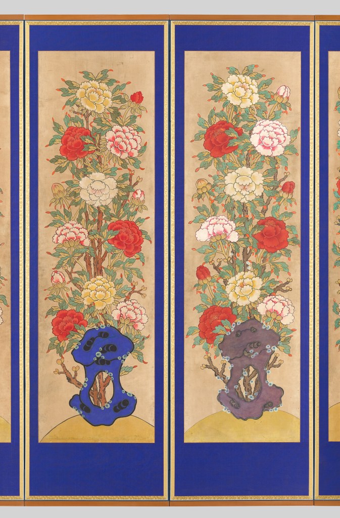 Peonies in Korean art symbolize wealth, prosperity, honor, nobility and longevity. Initially, Morando paintings were closely associated with the royal court. The peony’s symbolic association with wealth, honor, and prosperity made it a fitting motif for palace decoration.