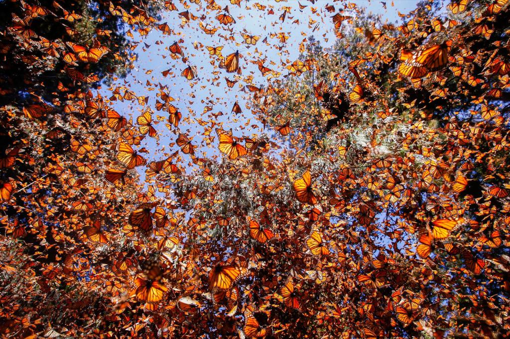 The monarch butterfly migration occurs in a seasonal cycle, involving both southward and northward movements. The fall migration (southward) starts in August and continues through October. Eastern monarchs spend their winter in the mountainous forests in central Mexico, most at the Chincua Monarch Butterfly  Biosphere Reserve in the states of Michoacan and Mexico. This reserve hosts aproximately 60 million butterflies that overwinter in oyamel fir forests at high elevations within this reserve