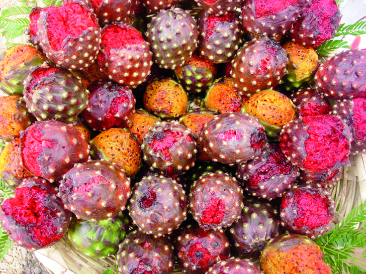 The flat green pads of the cactus are the nopales. In the upper part of the stalks, you will find red, purple and yellow flowers along with the prickly pear which are a delicious fruit with crunchy seeds.