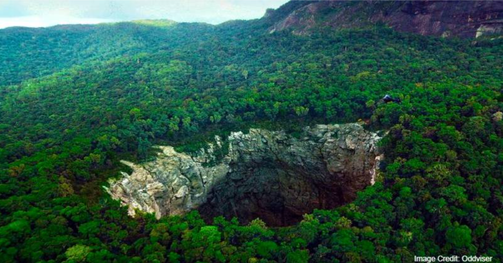 This cave is located in Aquismón, San Luis Potosí, Mexico. It is a open-air pit cave features an elliptical entrance, measuring approximately 161 by 203 feet, on a slope. The cave’s interior expands to approximately 994 by 443 feet, with a floor that plunges roughly 1,093 to 1,214 feet, making it the world’s largest known cave shaft. Imagine that you could fit the entire Chrysler building (from NYC) inside!
