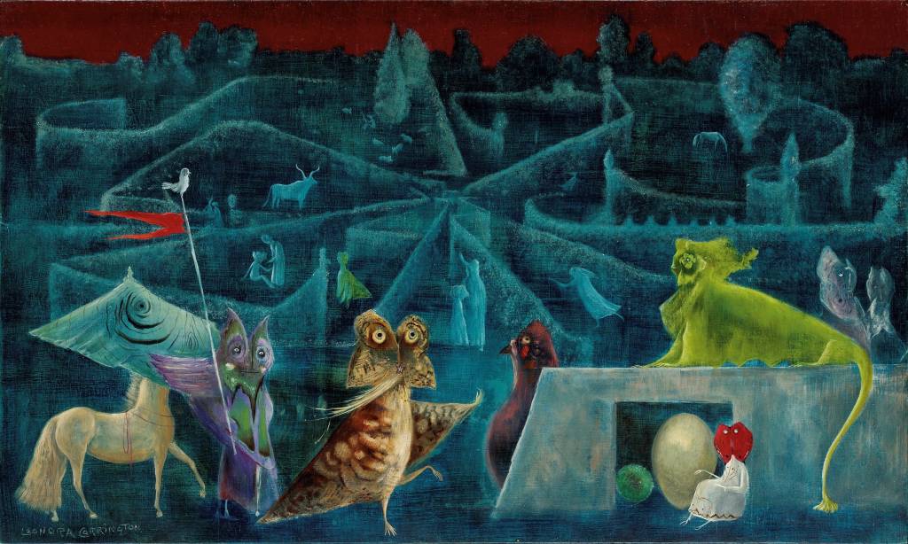 The hybrid creatures that inhabit the painting’s labyrinthine world reflect Leonora Carrington’s fascination with Celtic mythology and the diverse cultural traditions of Mexico. The disconcerting, monstrous figures in the foreground are arranged in a static row, as if performing in a play. At the bottom right, an egg—a symbol of fertility and rebirth—is guarded by a peculiar, red-headed figure. Carrington was deeply concerned with the idea of continuous renewal through self-discovery. This concept is embodied by the shape-shifting figures in the foreground and by the distant creatures searching for a way out of the maze in the background.