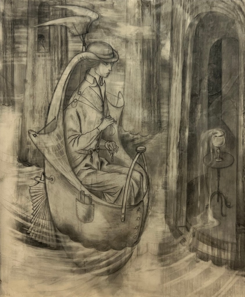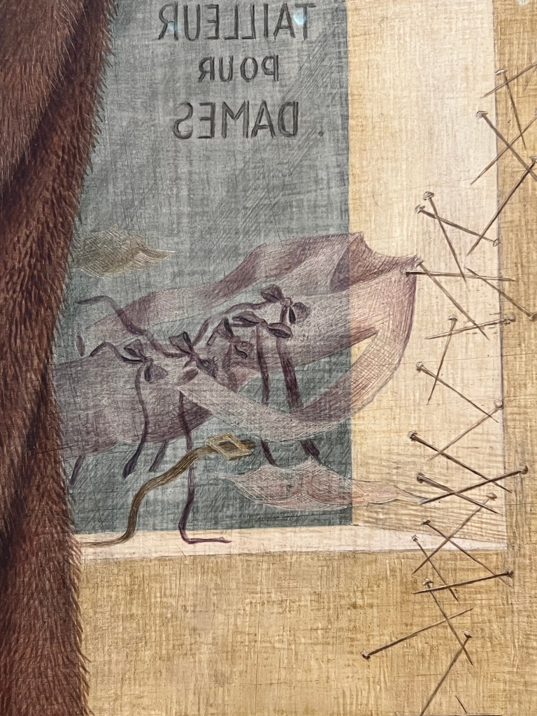 The client, according to Varo’s own notes, “splits into two other persons” to represent her indecision and inner turmoil. A figure of the tailor, whose eyeglasses are shaped like scissors, works in the background while a mysterious magnet on the floor attracts pins out of thin air. Through this magical tailoring, Varo illustrates how clothing can be a vehicle for escape or the creation of a new self, reflecting her interest in psychology and the powerful, albeit often unseen, forces that shape identity.