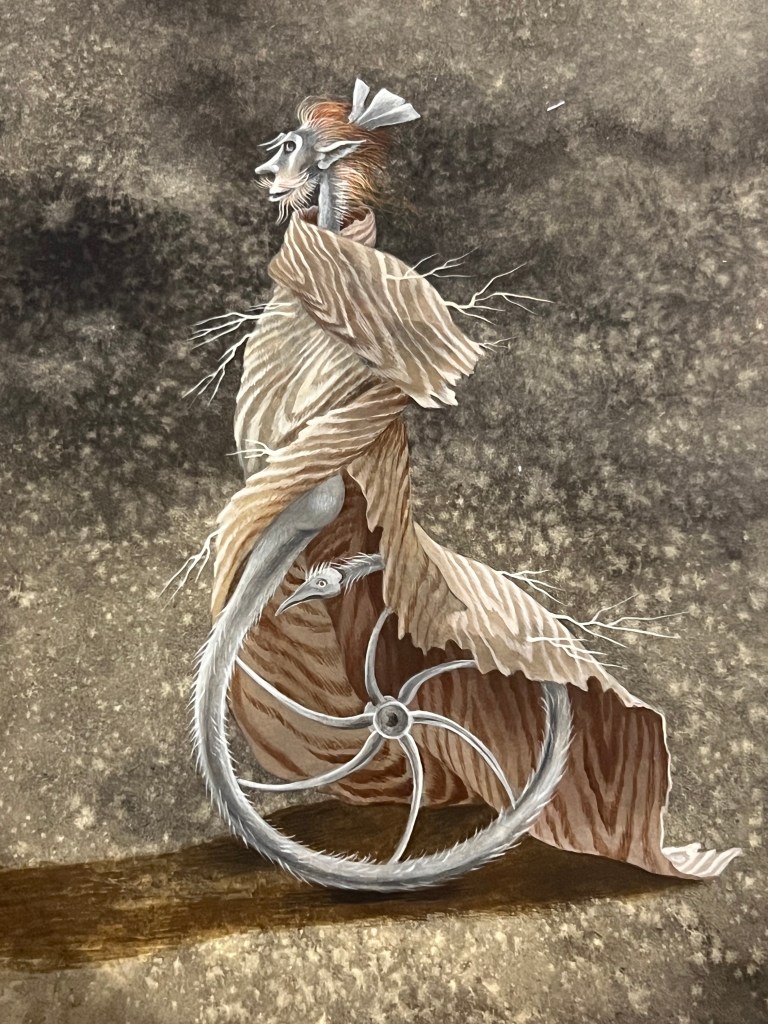 Exile and Journey: As a refugee, themes of displacement and the search for a spiritual or physical home are central to her work. Her characters often appear to be on a quest, journeying through surreal landscapes in precarious, dream-like vehicles.