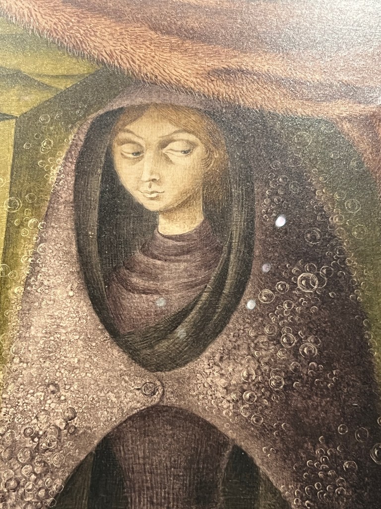I forgot to take a photo of the description so now I assumed it related to the trenches in a war… dead men trapped and the figure in orange like an angel. Now reading about it … I was wrong! The painting’s title itself refers to a divine or inner calling. The protagonist is responding to this summons, leaving behind a world of conformity and embracing a path of mystical knowledge and self-discovery. And she also empowers the female figure, who is not a passive object but an active agent. She is an allegory for the woman artist or thinker who must break free from societal constraints to pursue her creative and spiritual mission. WOW!!!