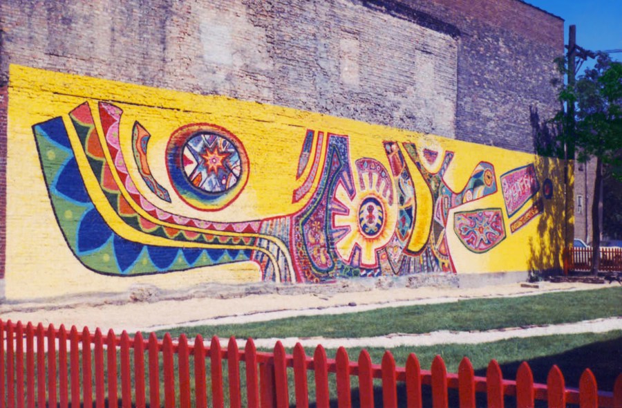 Sadly, this mural was whitewashed only a year later but not erased from history or its incredible influence in Pilsen. Shortly after murals started decorating wall after wall in Pilsen and even doors. This is what the Peace Mural looked like in its time: