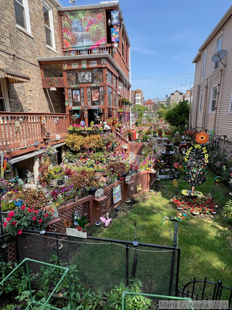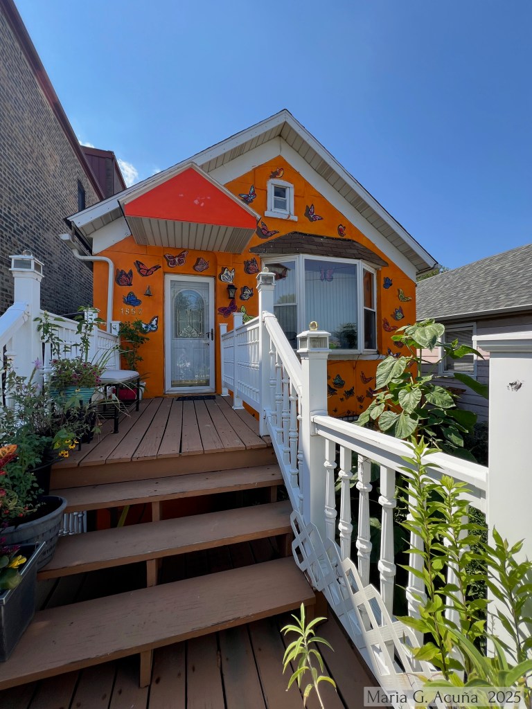 Héctor Duarte’s monumental mural, Gulliver in Wonderland, is painted on the exterior of his Pilsen home and studio, is a profound and complex statement on the immigrant experience in the U.S. Begun in 1999 and finished in 2005, the artwork is nearly 3,500 square feet of acrylic paint on aluminum siding, utilizing the bright colors and powerful symbolism characteristic of Duarte’s style.