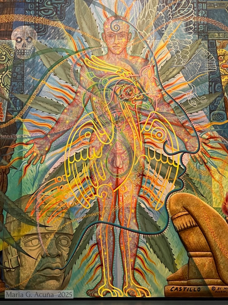 It was really hard for me to decide what artist to base my Mexican angel on. I admire the craftsmanship and art from Mexico so much… but seeing Mario Castillo’s “The Ancient Memories of Mayahuel’s People Still Breath” this past August sealed the deal. I really loved what he calls “Peceptionism”, in other words how the superposition of images made his painting almost alive and interactive right in front of my eyes.