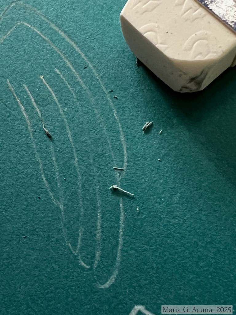 I removed the tracing paper partially leaving it connected to the final piece on the top as I could see very little. Then to “see” better I used the white color pencil to slightly shade over the drawing… it worked! It was almost like magic seeing my illustration come to life!