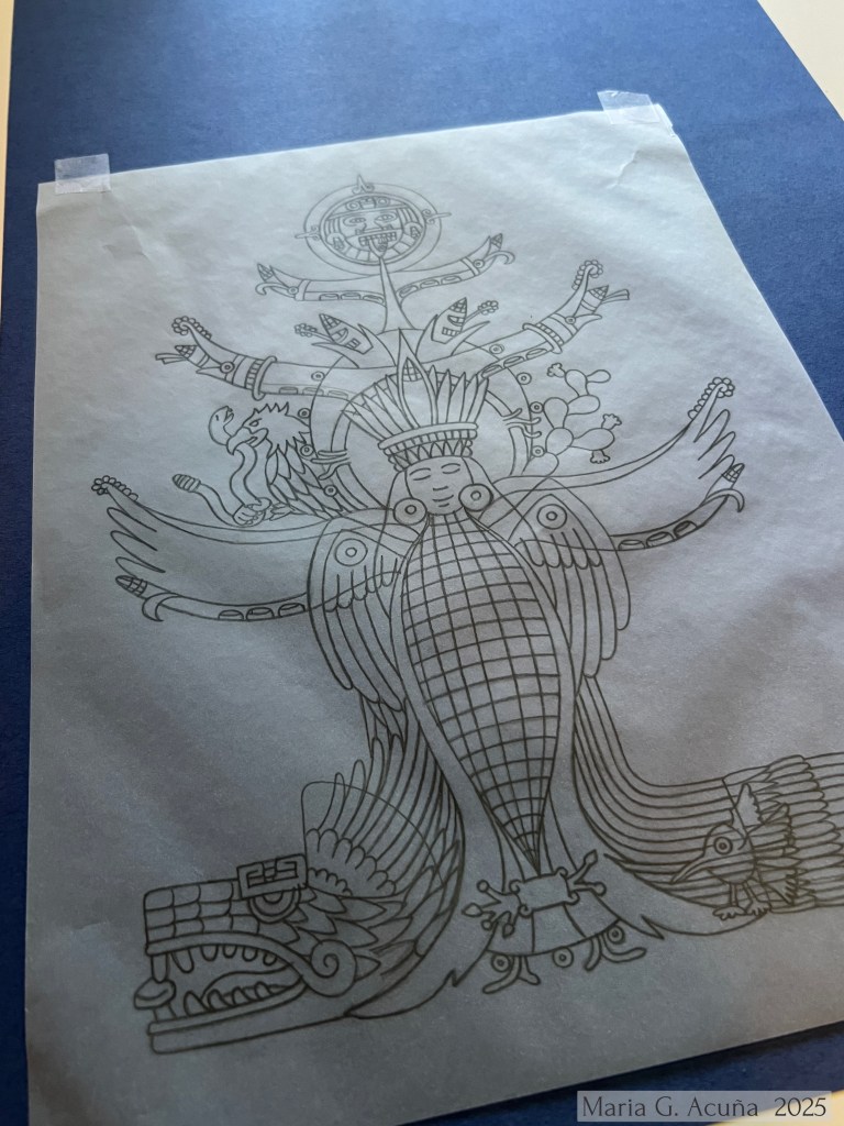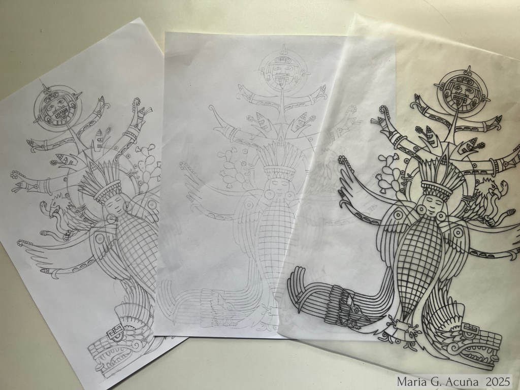 I finally decided to create a sort of corn stock / tree of life growing from her head! I added the angry corns, and used some of the decorative motifs of the Borgia Codex… and placed “Toniatoh,” the Mexica (Aztec) sun god at the very top… here is the final draft: