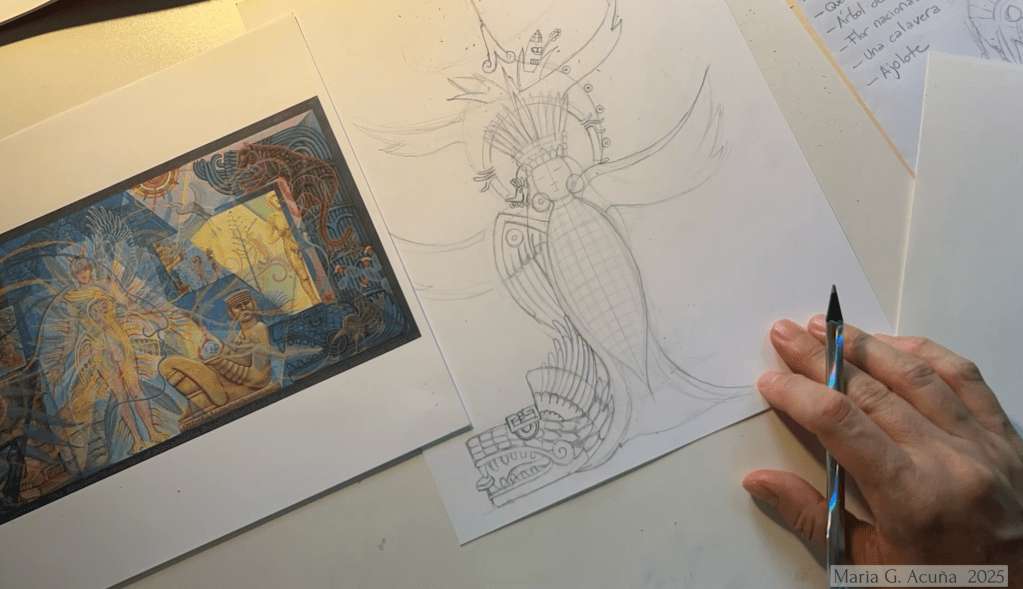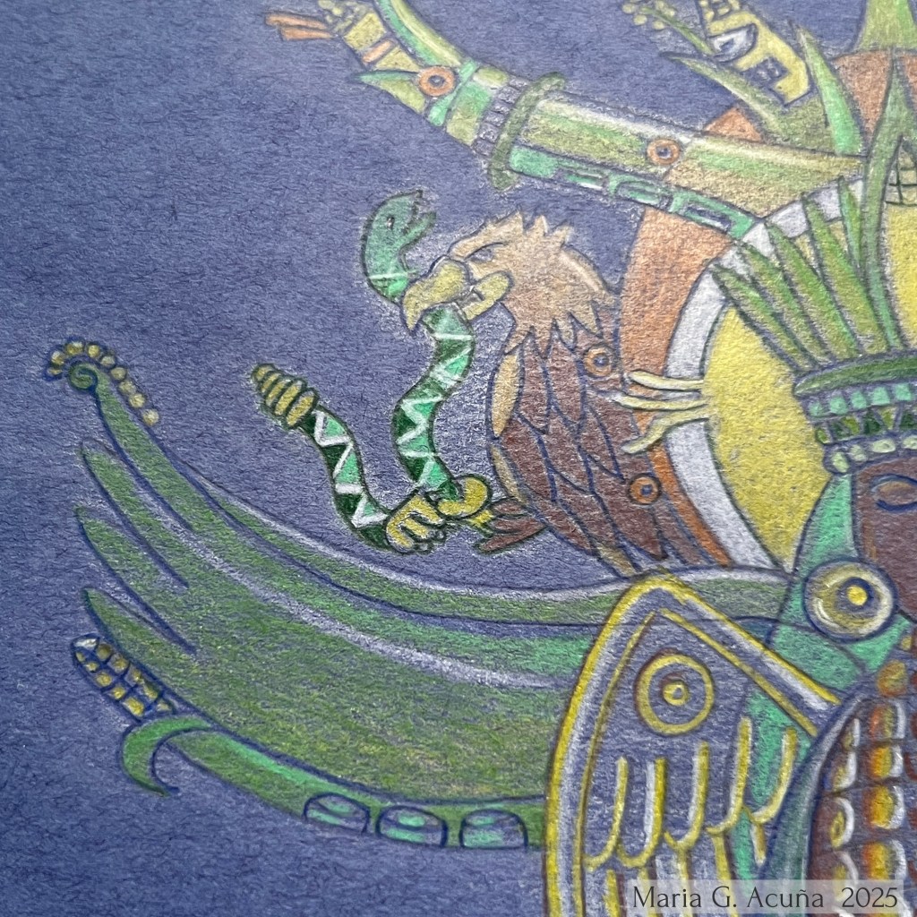 Then I incorporated Mario Castillo’s Quetzalcoatl at its base… and right underneath I placed the Mexica (Aztec) symbol for an island on the water that is below the eagle in the Mexican flag. I also used the wings in the man in his painting and the weird bird creature!